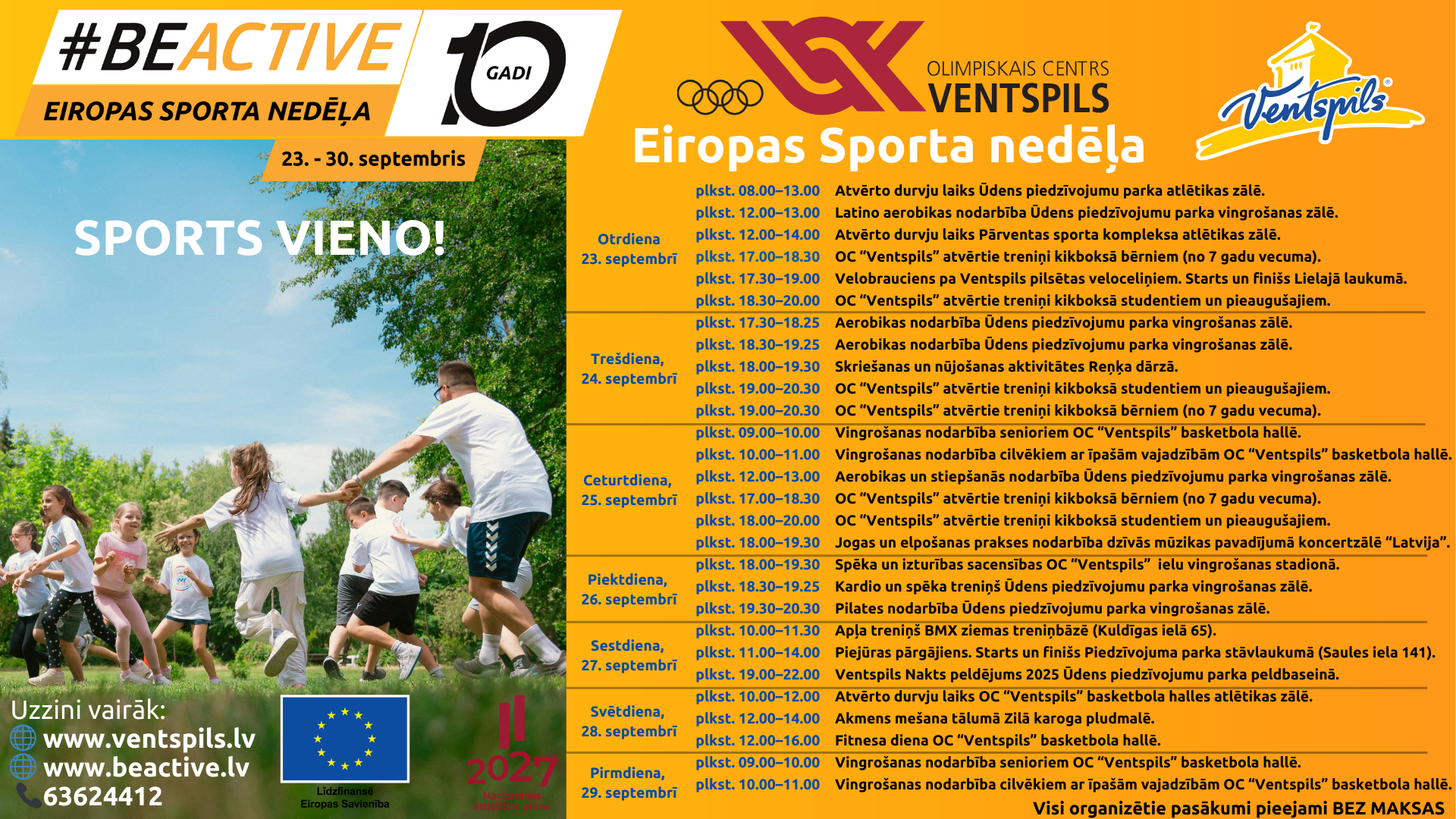 Ventspilī, Eiropas Sporta nedēļas ietvaros, tiks piedāvātas daudzpusīgas sporta aktivitātes ikvienam. Aicināsim iedzīvotājus piedalīties velobraucienā, pārgājienā, skriešanas un nūjošanas aktivitātēs, nakts peldēšanā, akmens mešanā u.c. Plānoti arī Olimpiskā centra “Ventspils” sporta bāzu un sporta nodarbību atvērto durvju dienu pasākumi, kā arī sporta klubu atklātās sporta nodarbības bērniem kopā ar vecākiem un citas aktivitātes.
