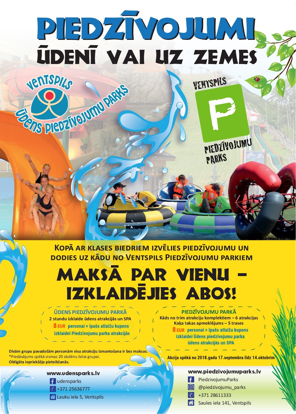 Šoruden kopā ar klases biedriem izvēlies piedzīvojumu un dodies uz kādu no Ventspils Piedzīvojumu parkiem. Maksā par vienu, bet izklaidējies abos!
